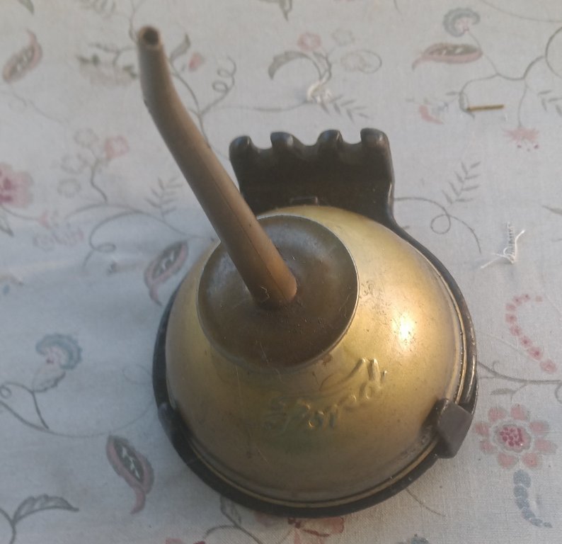 Unusual oil can holder I have never seen this style before . Cast iron and spring loaded . Looks NOS . Oil can not included. $75.00 plus shipping .