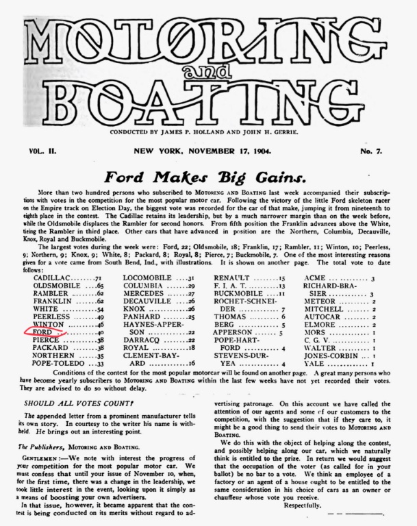 “Motoring and Boating” began listing the competition weekly on October 27, 1904. Ford did not make the published list of 16, evidently receiving less than 15 total votes as “best motor car.”