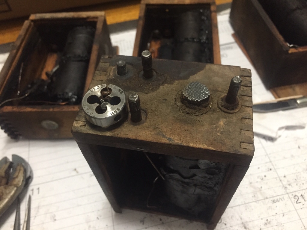 Now is the time to get the contacts on the tap all cleaned up and ready to use. I stole the contacts off of the plastic ones. Likely wire wheeling it looks like these were never used: I used steel wool to clean the brass a bit. I use this and four and a 0.005” shim to set the rivet. Obviously you have to have a pink anvil. The story behind this is when my daughter was three or four years old I was trying to get her interested in blacksmithing