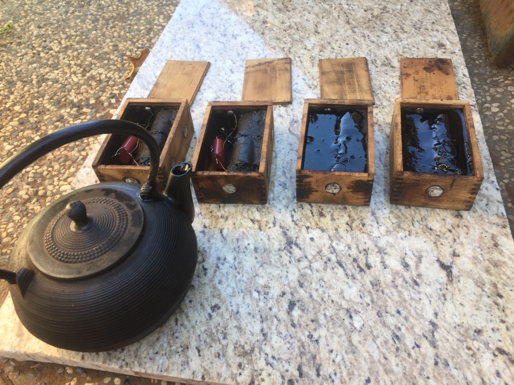 Time for the tar. I use a small Japanese cast iron tea kettle on an electric hotplate. The hot plate is not very powerful so I don’t have issues with tar boiling out, but it is slow.