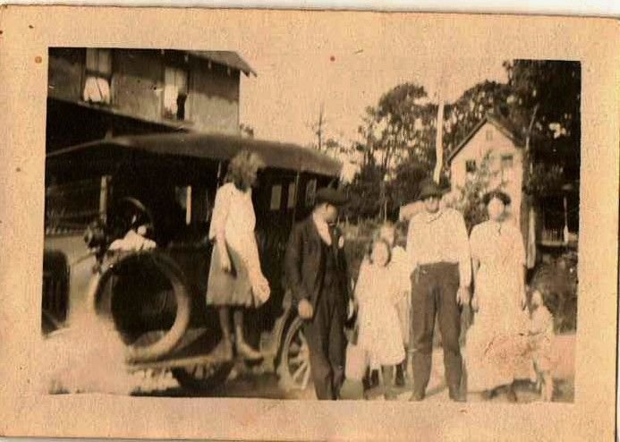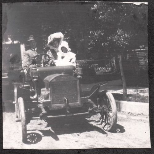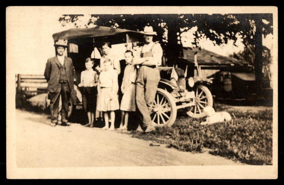 This last photo is a bit of a mystery to me. Is that a pet badger, teddy bear or dead gopher he is holding? It's staged to look like one of the youngsters is driving. I see a pair of feet under the far running board.