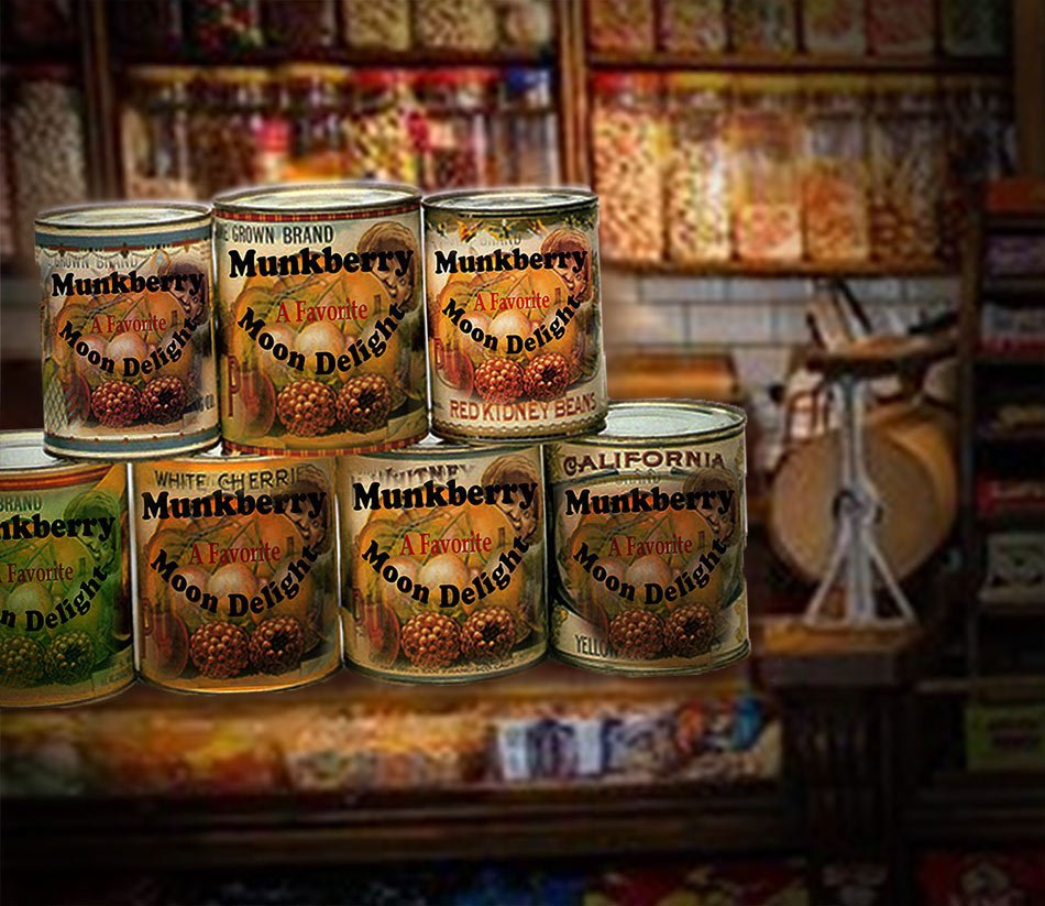 The munkberry famine hit the tri-burg area very hard. This photo from the archives shows Ma Furstenwurst's fruit cellar after she donated all the munkberry moon she had on hand to St. Swithin's Orphanage in Saddlestring. Rumor has it she held back one can of munkberry moon ( kidney bean flavor ) for Kalamity Dick when he made his monthly call. Dick had to eat the whole can of it at one sitting while hiding down in her cellar to keep the hoarders from getting it. A bronze plaque above the cellar door commemorated the event until it was turned in during the WWII scrap drives. Widgeon Schufelt provided a photo of it for the Institute's archives. Sigfreid is currently decoding it.