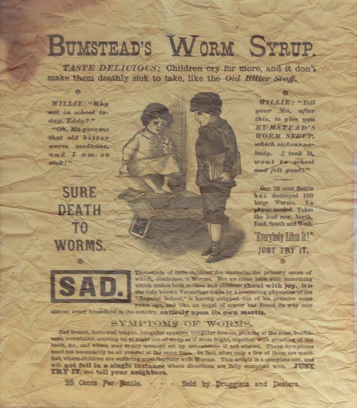 Bumstead's Worm Syrup, that claimed to kill 100 worms with every bottle. Also claimed, ....