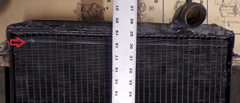 The gap is about 3/4". The radiator core should be 18-3/8" but is 18-7/8". So the core is about 1/2" too tall and the top tank is 1/4" too tall.