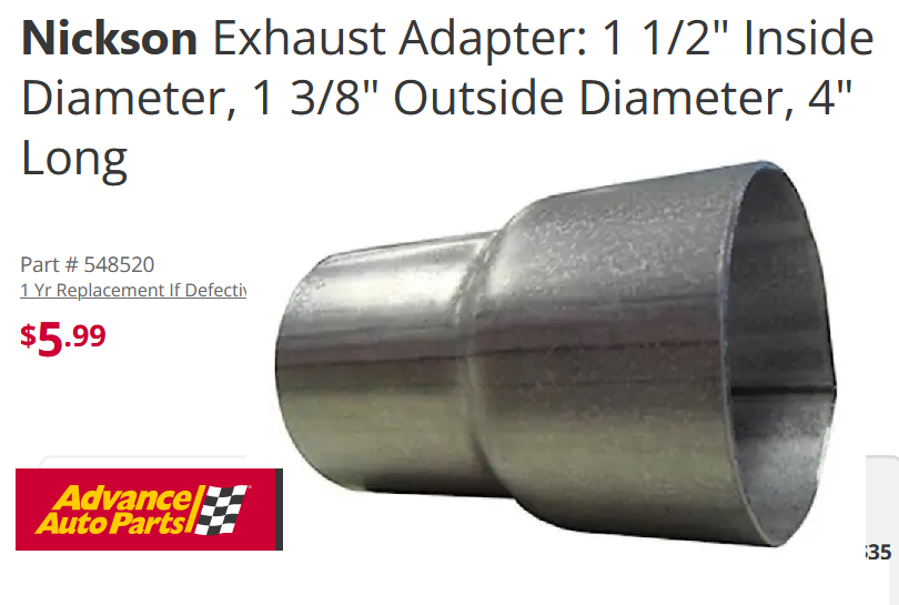 Shout out to Steve Lang for taking time to trouble shoot with me this morning - I really appreciate it! I mistakenly said the inlet was 1 3.8", when it's really as Steve said at 1.509" ID. I'll be investing in a set of calipers today. We talked through a few solutions and I'm going to go the route of using a bench grinder to shave down the end of the exhaust pipe just enough to slide it into the muffler inlet. (Dan - thanks for suggestion and pictures!)