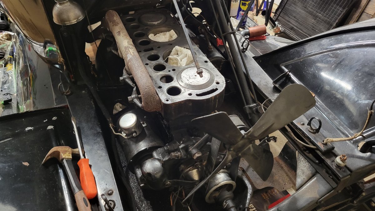 Yesterday (Saturday) we pulled the T out to wash it and get ready for the show. In the driveway, before we got a lick of water on her, the radiator started leaking like it had a second drain valve. I pulled the radiator to see if it was something I could put a temp patch on but the leak is not in an obvious, easy to reach spot. I filled it with water outside of the car and looked for weeps. I think it is from the side or top of the lower tank, which is obscured. So no car show today. My son was looking forward to the police escort through town... but that will have to wait until next year.