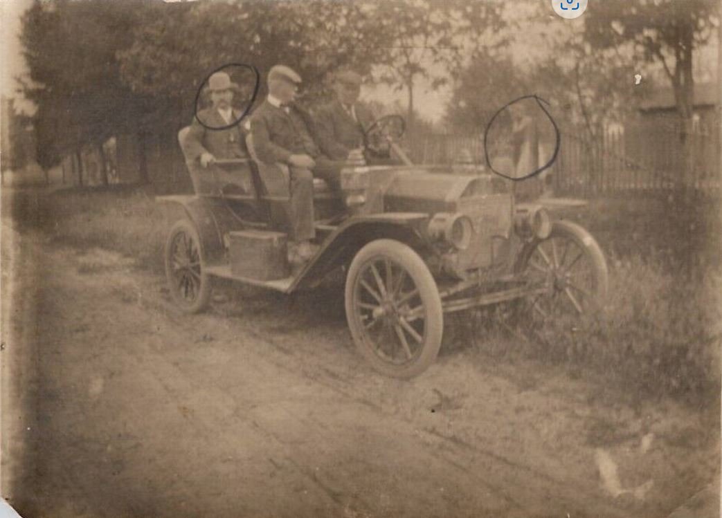 The early 1909 T, the hand cranks were held in place in a upward position. This is normal and all early Ts were that way. It also looks as if it has a Brisco radiator wh Does anyone know the history of this phto?ich was standard on the early Ts. It probably is one of the first 2500 Ts, which had a built in water pump. It would have been great if the left side was visible. It could be a two lever model. Does anyone know the history of this photograph? It is a copy. Camera shutters at that time were slower, so more time was taken to take a photo, so most all had great detail.