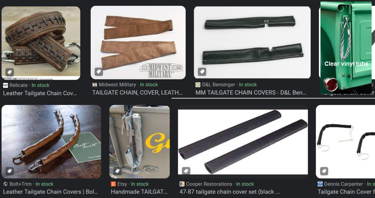 I have numerous original 1925 photos of Ford pickups, and none that I have show a cover over the tailgate chains. Did Ford make such an item, and if they did when was it issued? I have seen examples of current offerings, but dislike the appearance. I made covers for mine out of top material, which are not correct, but do the job. I sewed them into a one inch diameter sleeve, which looks presentable to me, but was a challenge to make because unlike the current offerings, I sewed mine inside out which made turning them around a challenge.