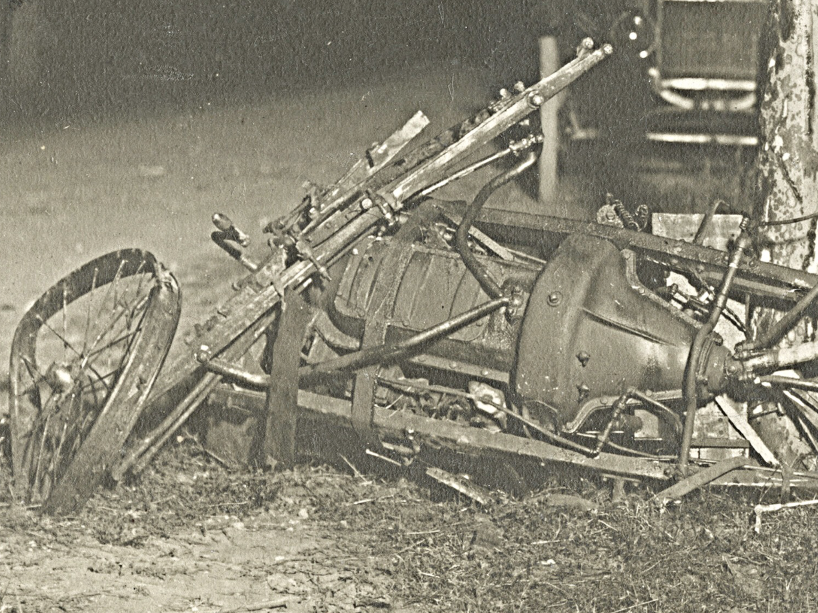 The wreck was the 4-1/2" x 4-3/4" engine racer built for the French Grand Prix race, which is a 302.2 cubic inch displacement Ford Special Depasse entered. It was in the New York newspaper and the article said Frank Kulick might have be the driver or the Frenchman.