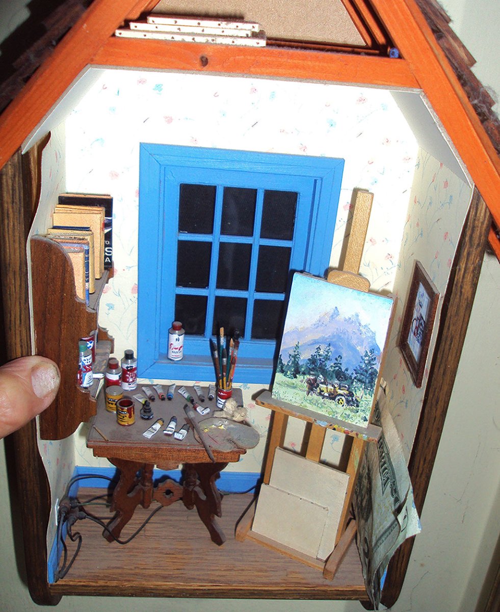 This miniature I made for my wife Joy for Christmas years ago. She is an artist. The table is copied from one we found in the dumpster behind a church. The overloaded wall socket is inspired by many safety meetings we attended at work. Paint tubes and cans were turned from steel and the brushes from wood.