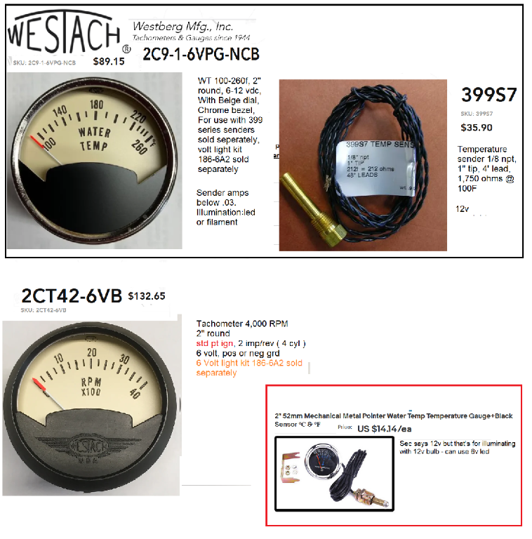 You can add a temp gauge and tach using 6 volts. My car has a period-looking electric tach that runs on the stock T system. I don't know who made it, but it looks good and works well. Model T Ranch in Spokane might be a source. Non-electric temp gauges are widely available.