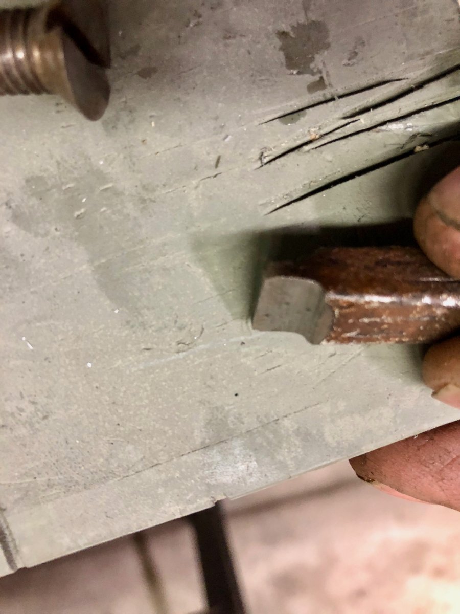 I did manage to get one loose, but the others would not budge. So I sacrificed one of my extra chisels to make a "tool" that would work and fit the new screw correctly to reinstall.