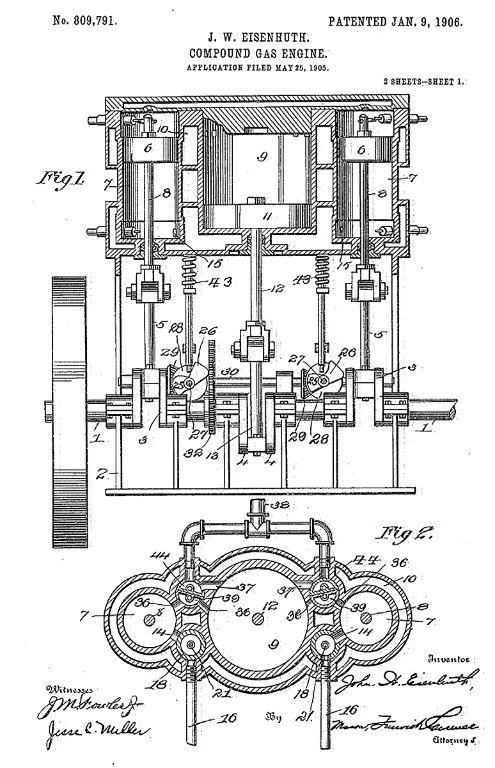 I was impressed by the 1906 Compound car at Harrah's many years ago. It's engine "operated one of its cylinders from the force produced by exhaust gases from the two explosive cylinders. The result was a reduction in noise and saving power". That amazed and amused me.