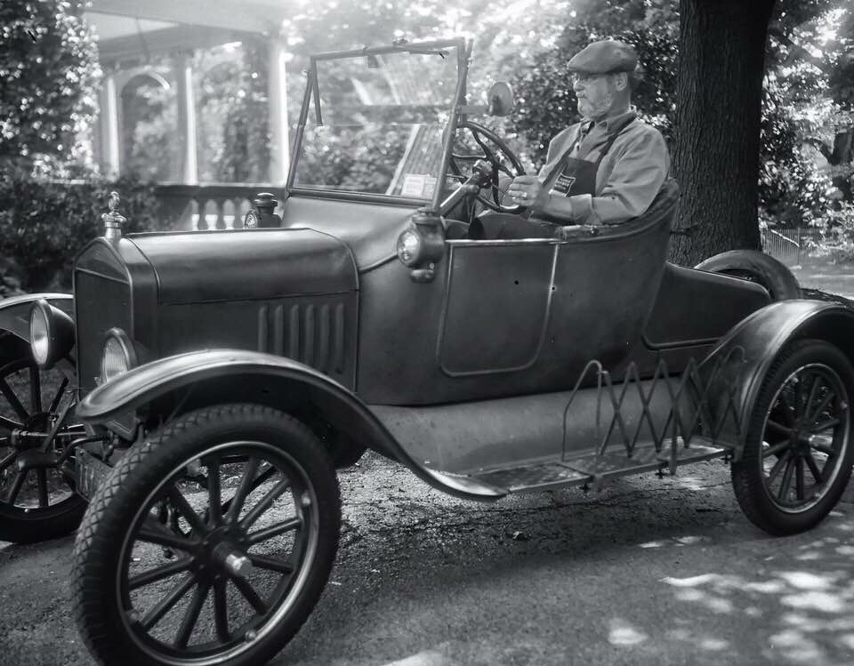 This image of me in my runabout was taken last year on a 4x5” gelatin dry plate glass negative like the type popular in the model T era.