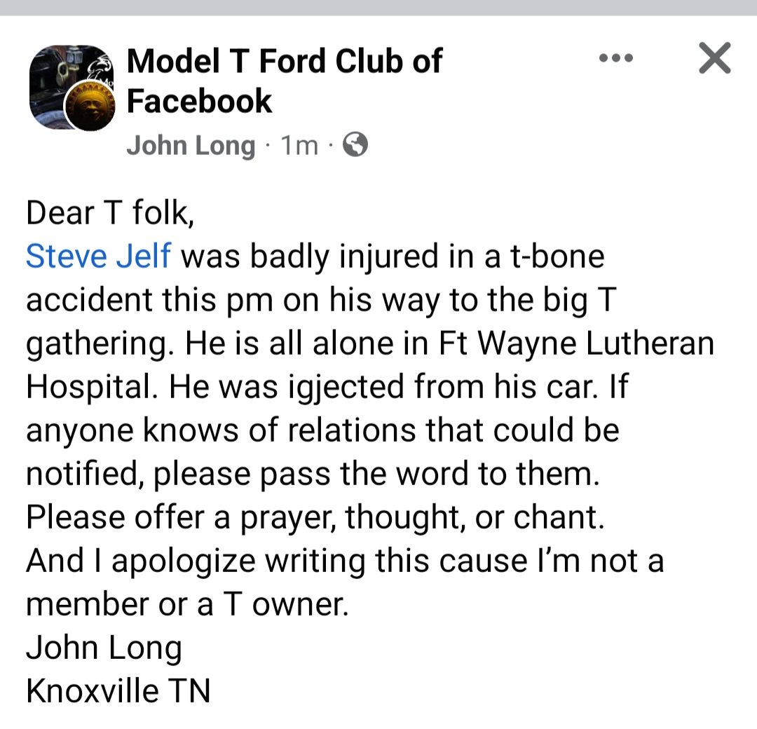 So sad to hear this. Best wishes to Steve for a safe recovery on behalf of Model T Owners of Queensland. Australia. Many of us follow his posts.