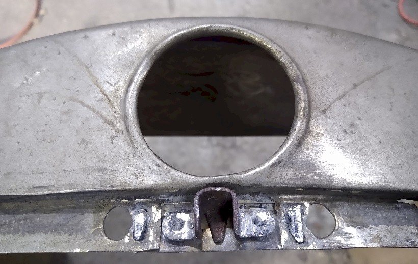Very small but important. Bought two radiator shells and both were broke. Cut the rivets off one hood rod support bracket from the ripped shell #1 and welded it to a piece of stainless steel. Drilled four holes in shell #2 and plug welded through the brass to the steel underneath. Then connected the plug welds on top. All photos are shell #2.