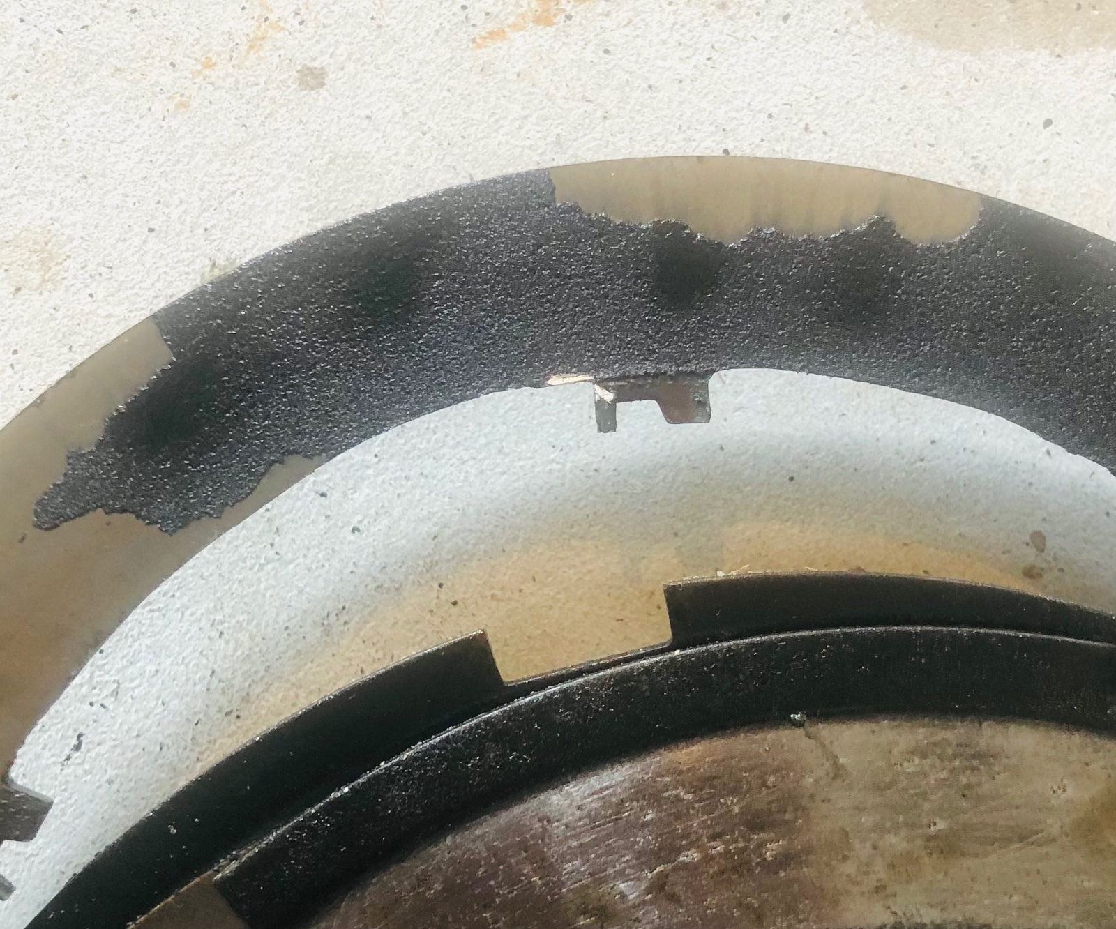 Appears in the photo that that set of worn modified Turbo 400 discs are the lower performance type (i.e. lower cost discs) because they show a "in - line' groove facing, friction material. Think perhaps the liner steel for the circular tabs could have been poor heat treat or something to wear that way?