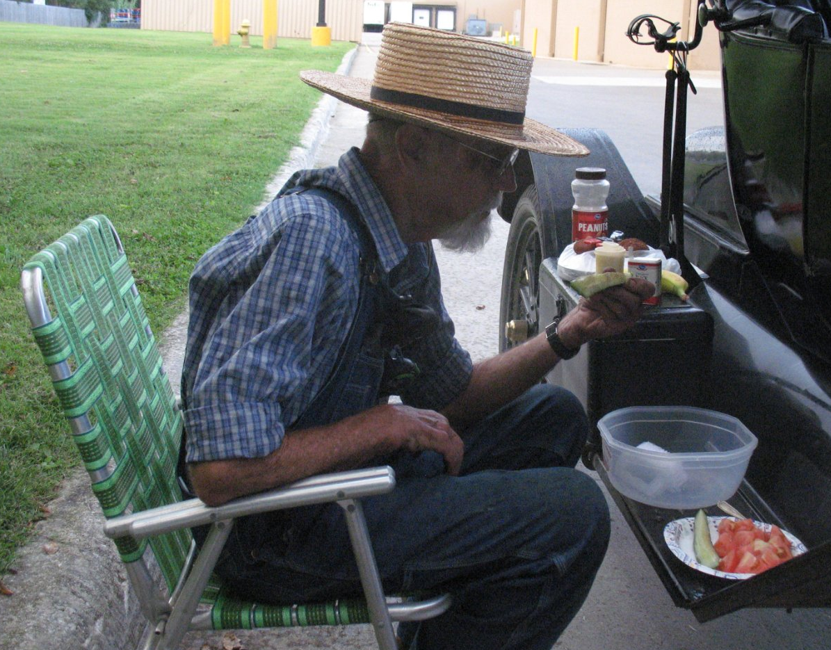 I bet this dish of Tomato's & (Pickles or Cucumbers) ,; with Fig newtons, Mozzarella sticks, bananas would really lift his spirit. Looks like he likes salt & pepper too