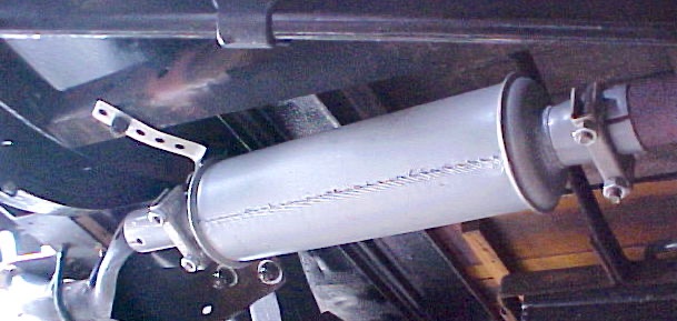 This might be a little hard to make out but I build a bracket from 1" angle iron, bolted it to the frame in the muffler hole and put a U bolt around the pipe.