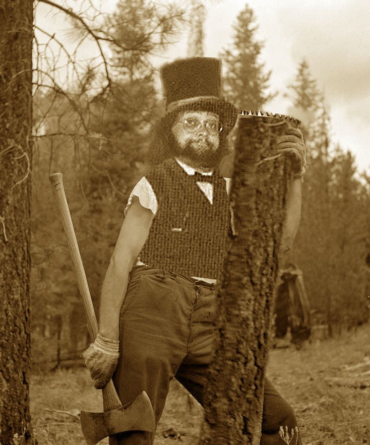 Very few craftsmen were able to match KD's skill with a double-bitted axe, holding tolerance within .0001". The wooden ring gear did not give optimal service, however. During the vanadium shortage, KD began to rely on cow horn to fabricate replacement parts. Photograph is Cuthbert and one of his ranch hands gathering raw material for one of his projects.