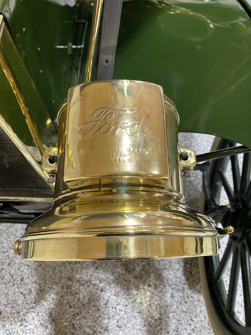 The head lamps are original Jns Brown Model 15’s and are connected to the gas generator with correct tubing. The side lamps and the tail lamps are beautifully restored Jns Brown Model 60’s. I agree the tail lamp should be marked Model 75 but I gather for a few months they were marked Model 60, same as the front. Mine has the correct “error”.