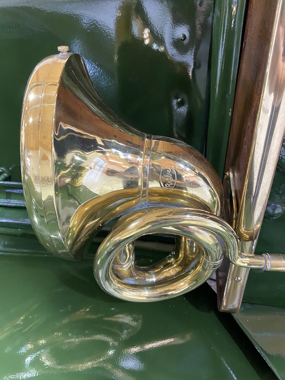 The horn is the correct double loop Rubes and is equipped with a RANDs windscreen. The working speedometer is the correct Model 24