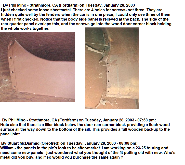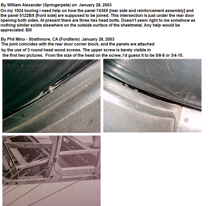 A 50+ year old memory may not be worth much, however - at the time we were scrounging parts from a lot of discarded derelicts that were untouched by restoration. I recall seeing a number of bodies in that age range where the side panel just behind the rear door was joined to the rear quarter panel with round-head wood screws. Others may know better.