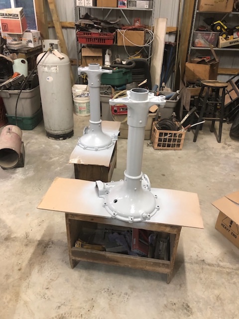 Finally got around to the rear axle housings today. Probably removed 15 pounds of filth and crud but they’re clean and in primer! I’m pretty sure there was about 2 quarts of sludged gear oil in the tubes.