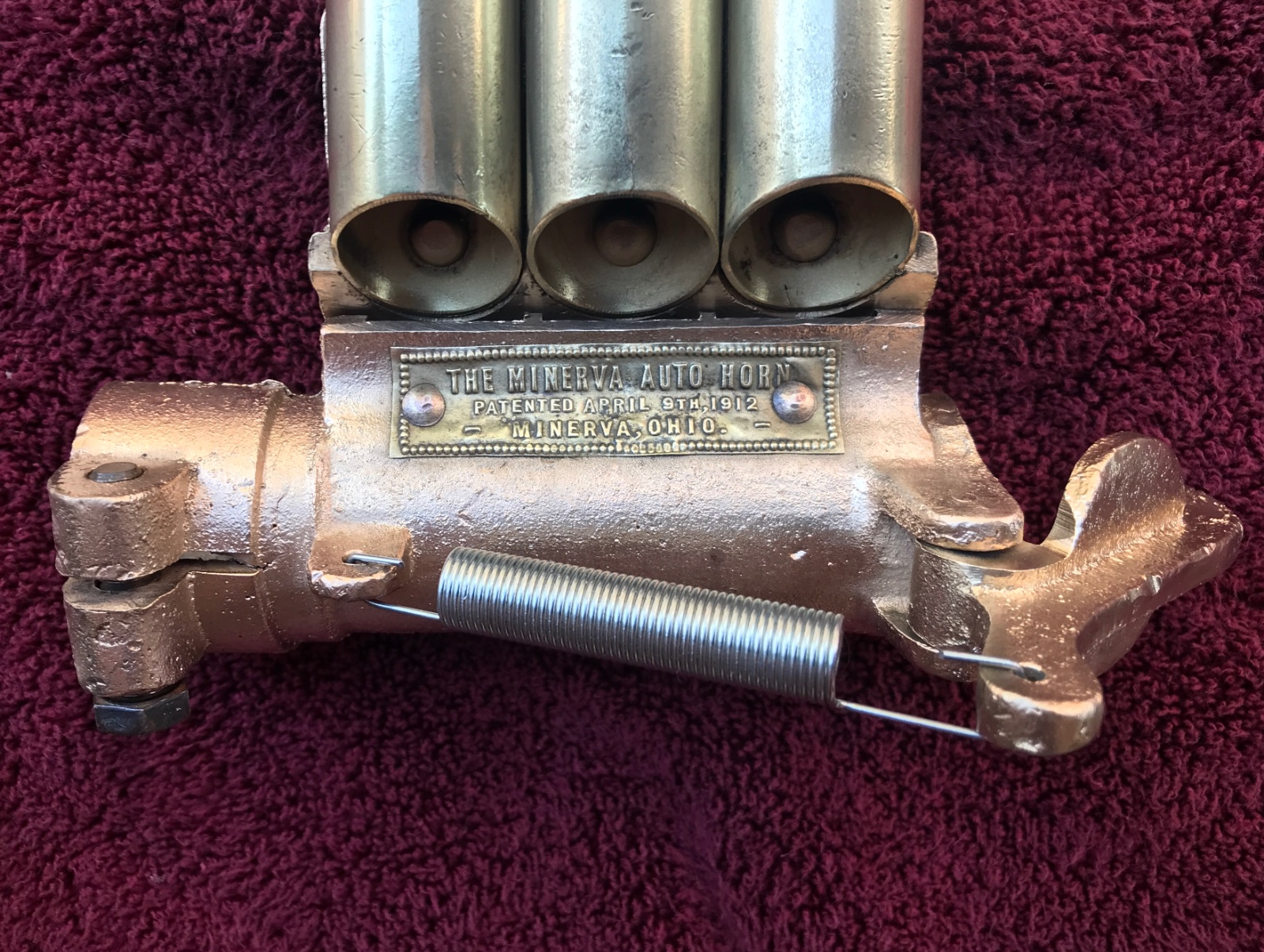 Original brass Minerva exhaust whistle. Designed to clamp onto the end of a 1.25 muffler pipe. Great condition, and puts out a loud train whistle sound at speed. Works by pulling little spring loaded door closed from front seat, diverting exhaust pressure through the whistle. Good solid shape, with numerous small road dings and imperfections on brass tubes, but still shows nice. 1912 patent date. 300 includes shipping.