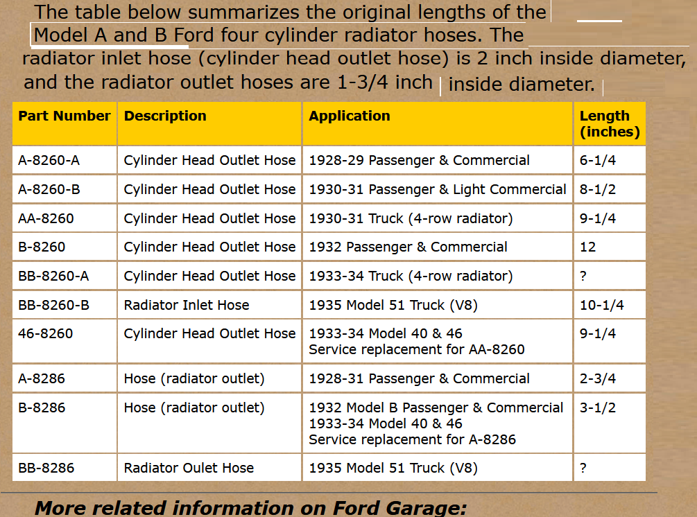 Thanks Frank. I wasn't aware of the Model A hose dimensions. Looks like the way to go!