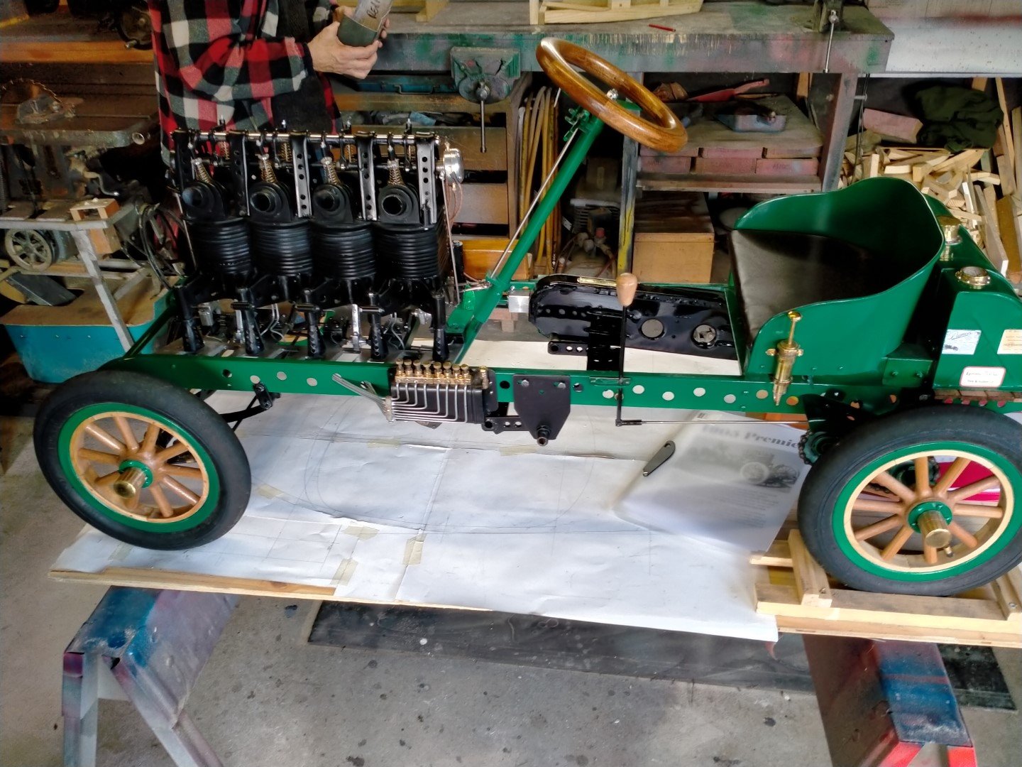 A friend of mine is constructing a child sized pedal car of the Noel Bullock 1922 Pikes Peak race car. His interest in building the racer is to make the complete drive train shaft and gear driven instead of typical chain drive. He also wants to detail the engine as much as he can. Stu makes fabulous replicas of older race cars with as much authentic detail as he can using recycled and repurposed items.