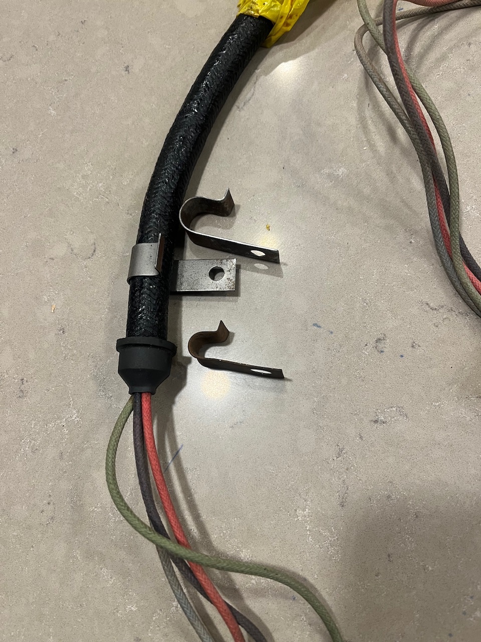 I just purchased one for my '13, as I "re-restore" her, to replace the previous thoroughly oil soaked one, reportedly installed when the car was initially restored c. 2003. The brass dash clip is present, but there were no clips to hold it to the hood shelf, so it lay on the splash pan - hence the "oil bath wire loom". I suspect they are both too short to be secured to the hood shelf !