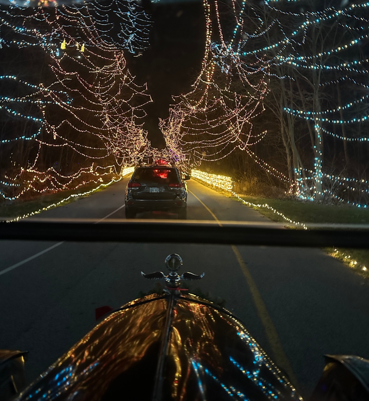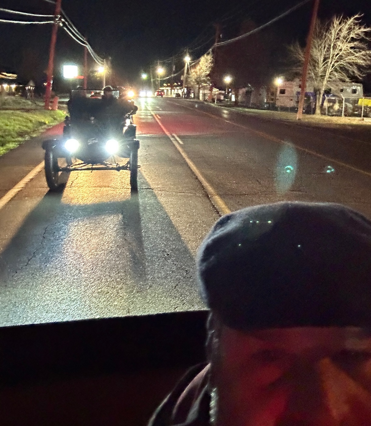 Drew and Bob might be OK because the lights are on their cars, but with a black car and everyone else enjoying and looking at the lights around it would be very dangerous. I guess a lot of bells and lights on the car would be safer.
