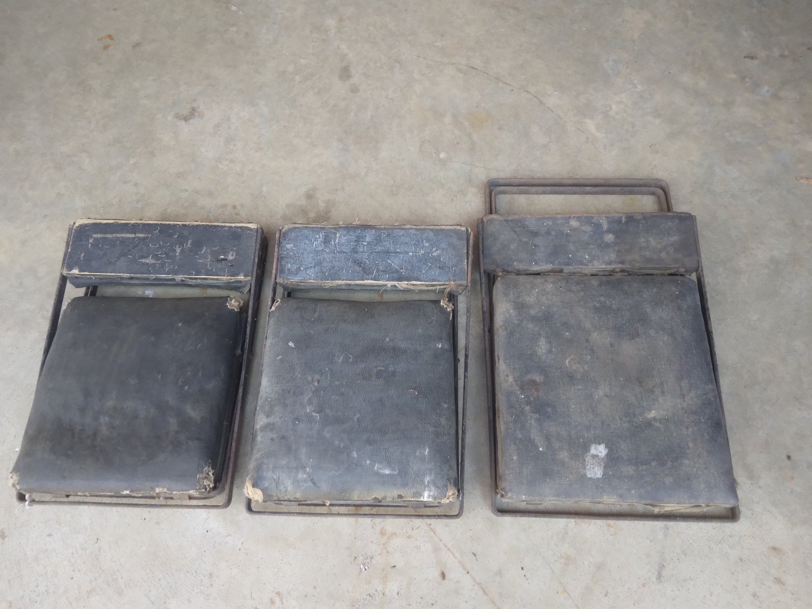 The tall chair is missing the backrest padding. The wood and metal are excellent on all three chairs. They will restore very easily or replace the missing leather backrest cushion with old leather and use as original survivors.