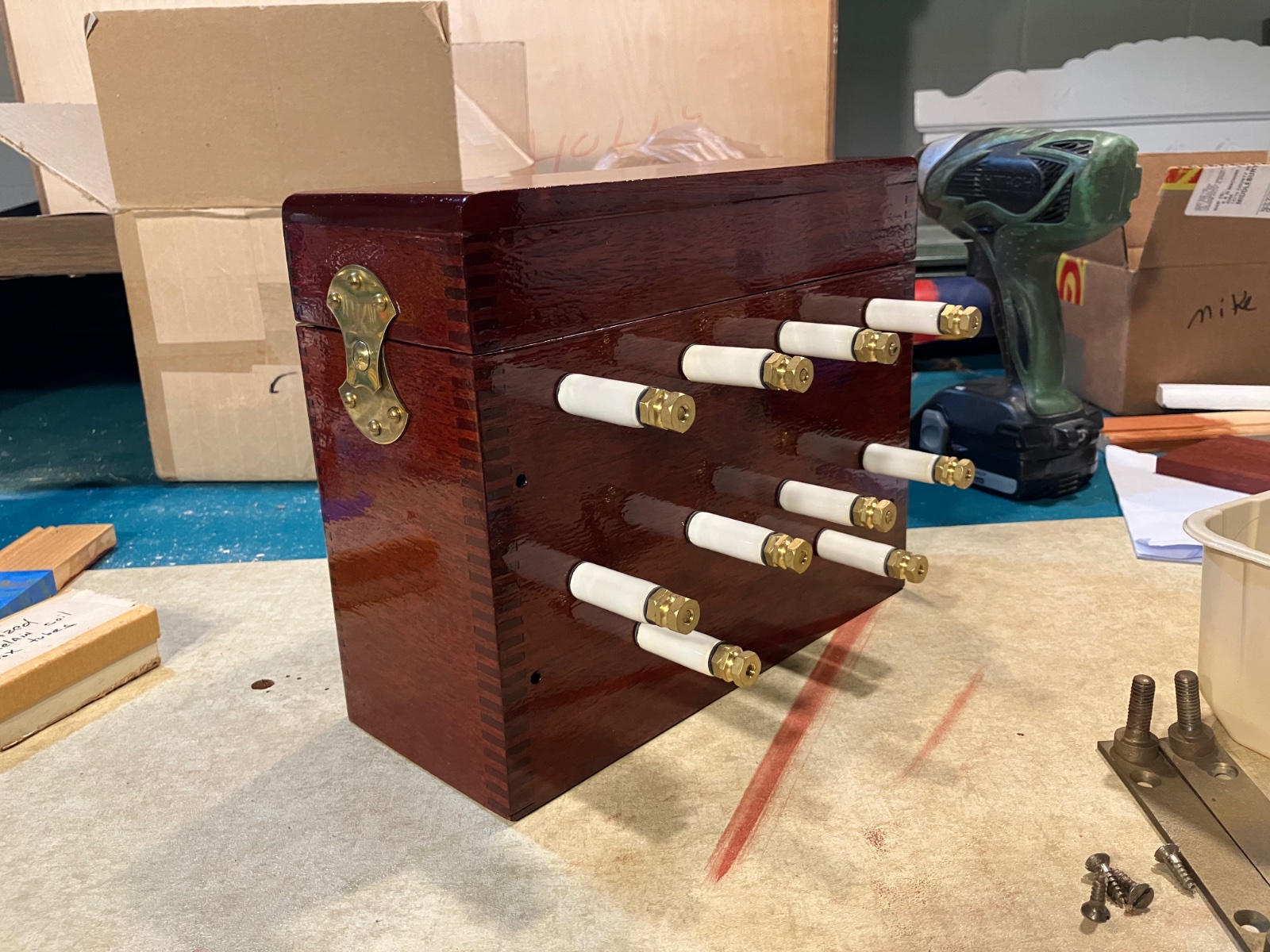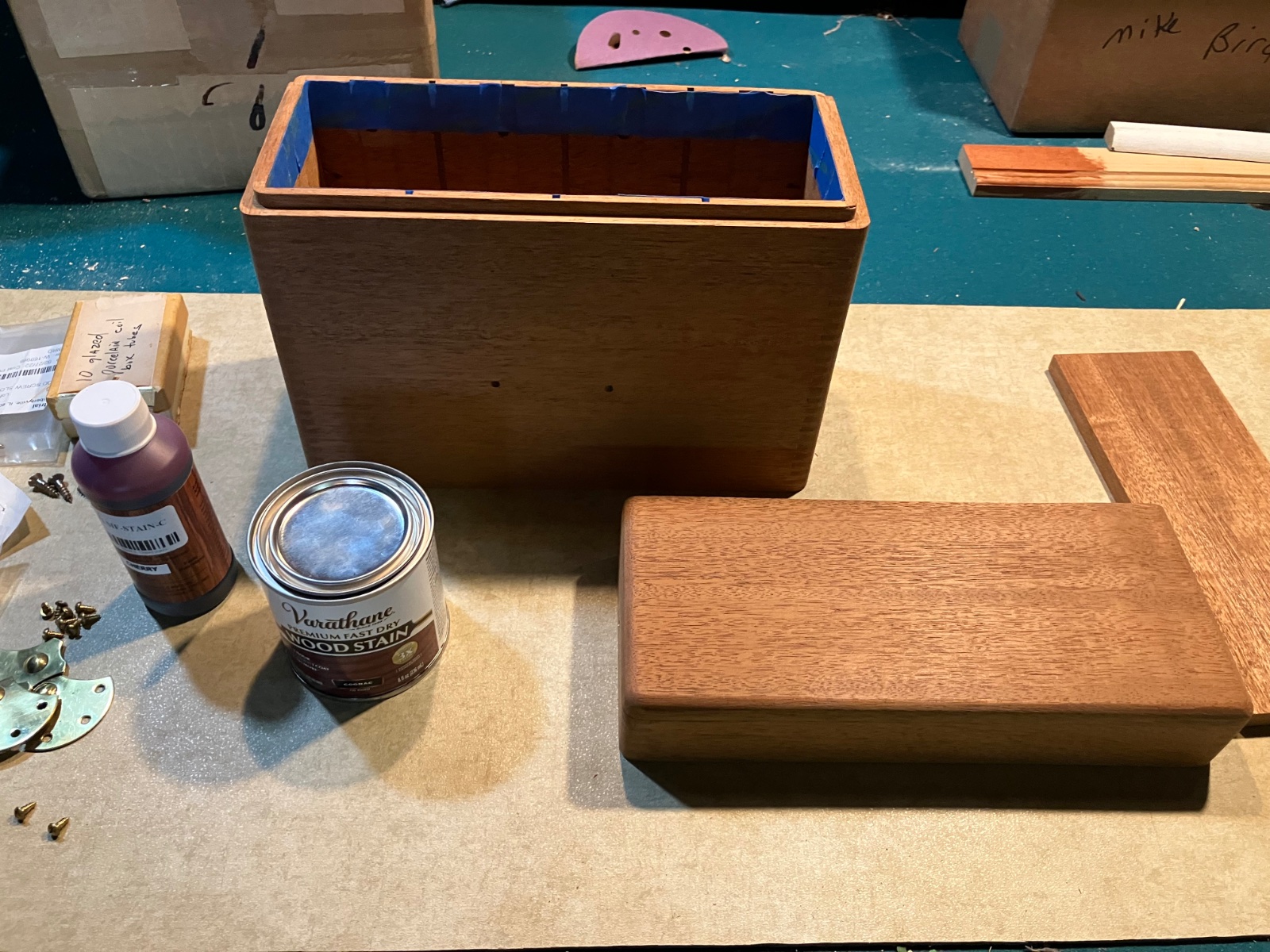 Thought I would share some pictures of the coil box that will be going on the Delivery car. I opted for a Kingston repo box that takes the later coils. I used the LMF Cherry stain and a Cognac to darken it up and give it a little more color. I finished it with 5 coats of Helmsman clear gloss