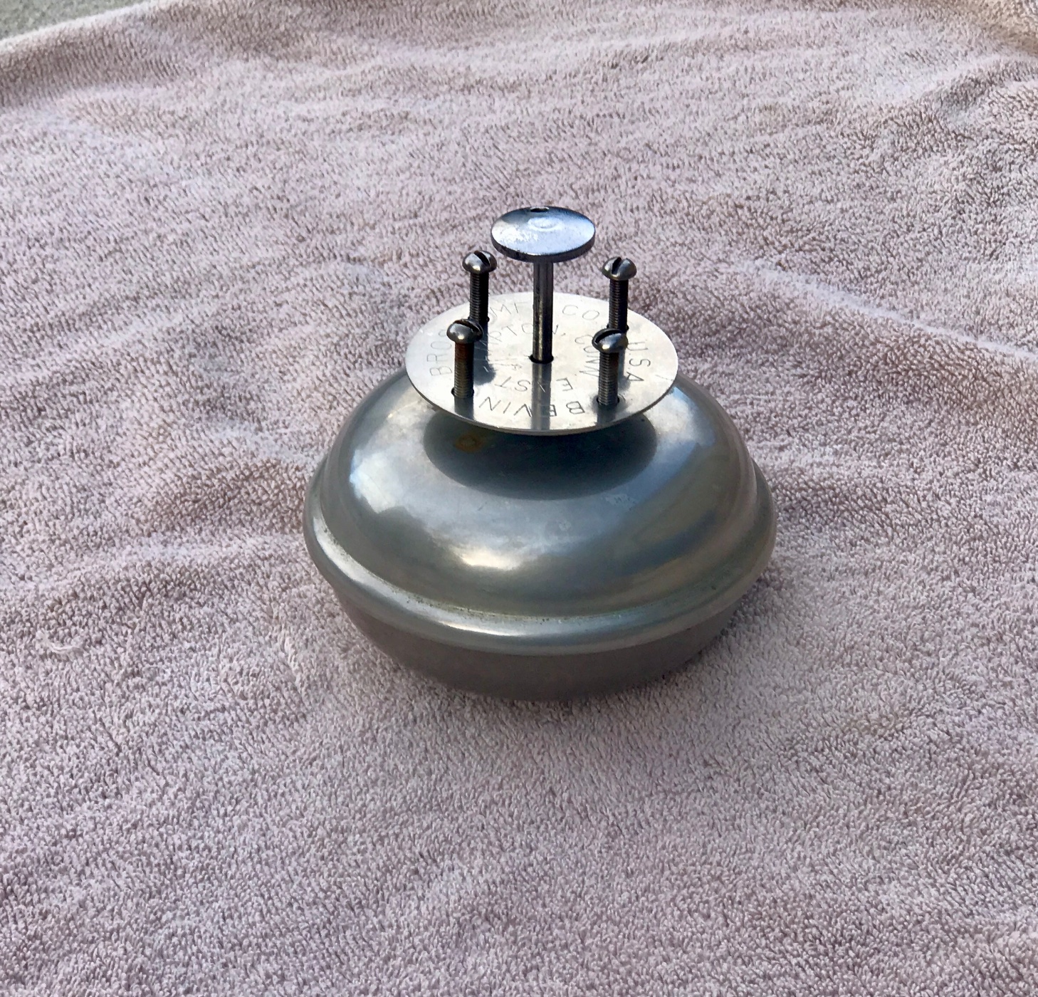 Very nice bell in great condition. I have a couple. The one shown has a hole drilled in the plunger cap. Wonder what that was for? I have never seen the hole before.