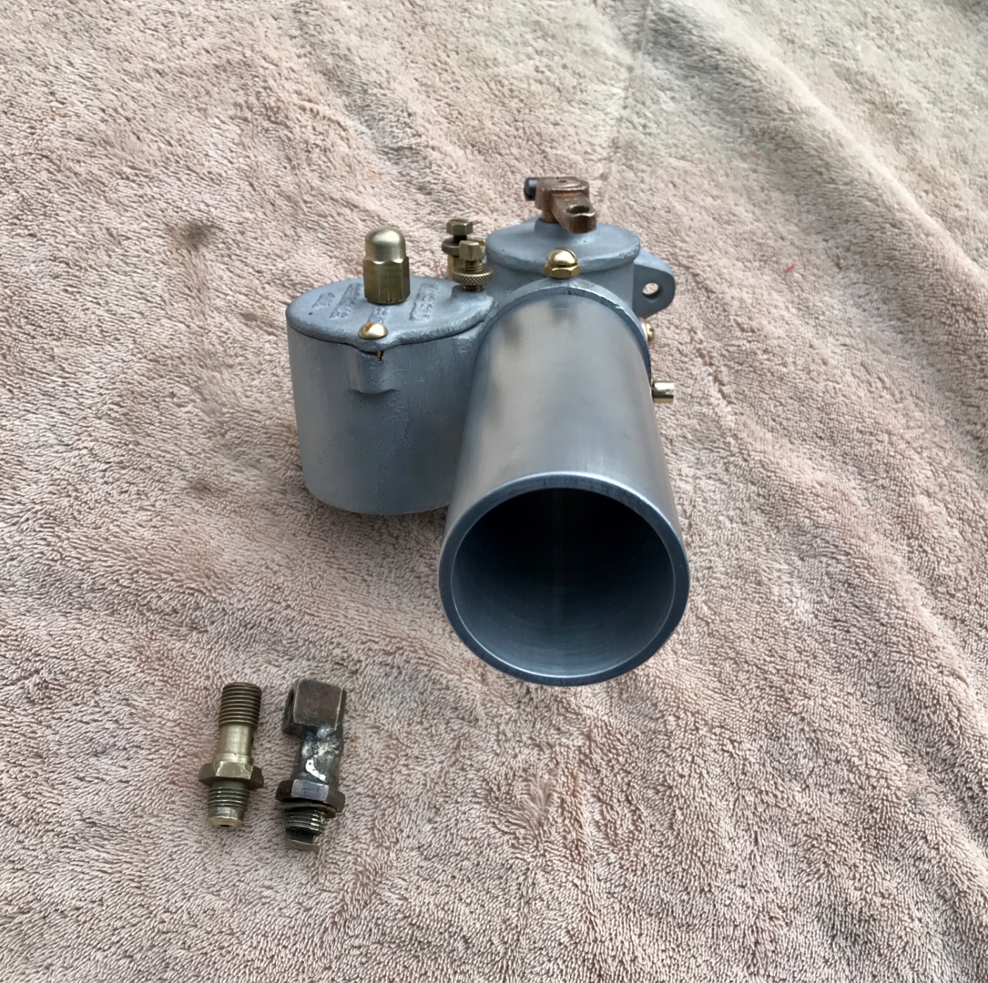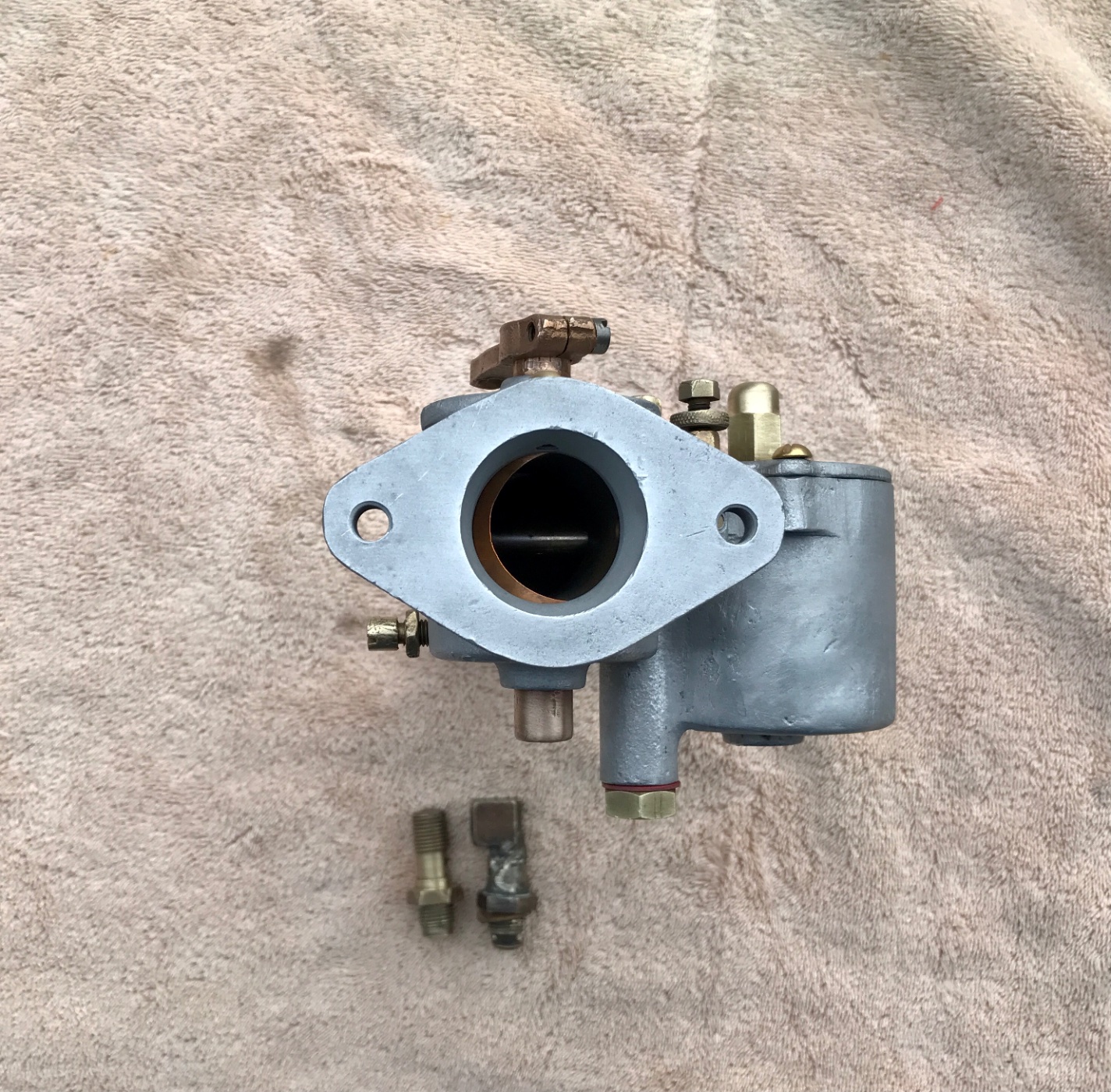 Original Ed Winfield H side draft racing carburetor. The rarest of them all. Good rebuildable condition, complete with barrel float. Throttle barrel nice, turns smooth in bore. Brass throttle arm will need worn oval hole on end brazed and re-drilled back to shape for desired throttle linkage. Cast aluminum body, no pot metal. 2-11/16 between mounting holes, 1-3/8 opening. Included two float needle seats, one modified, one unmodified so the needle can be sealed and reset. 600 includes shipping.