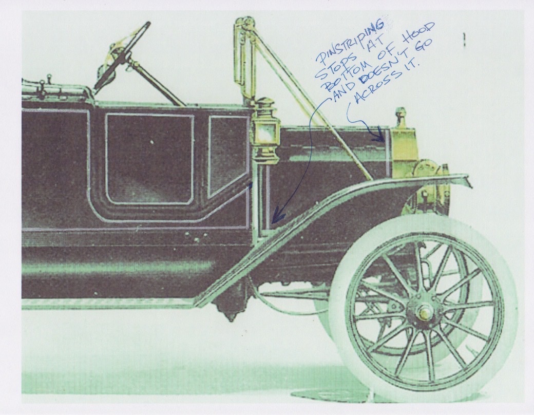 The first area that I need to address is the pinstriping on the hoods. I have not seen evidence of each hood panel being boxed out with pinstriping. This was also addressed in the second link under 1912 in my original post above. Below are photos of a 1911 and a 1912 that show the hood stripes fairly well.