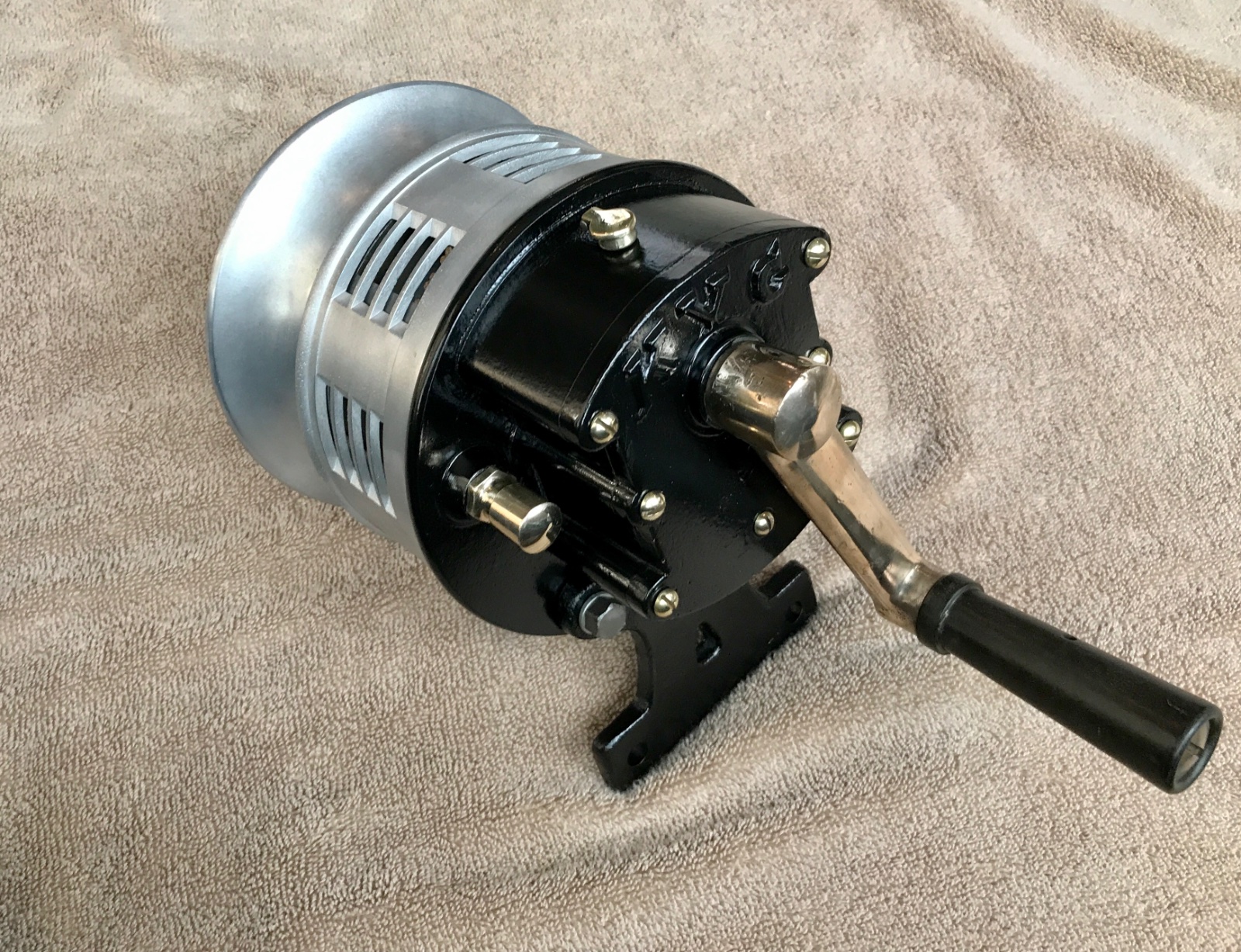 Beautiful original, dashboard mounted, hand crank, fire or police siren. Very heavy duty, precision cut steel internal gears. Solid brass crank. Brass push button brake. Aluminum cast bell. This is a professional grade siren. It is a monster. Puts out an unholy very loud wail, and can be heard across town as well as by the dead. Perfect for that fire or police car, speedster, or early dashboard T. Let the whole neighborhood or T meeting know you have arrived. Thrill the grandkids and the ladies. 6.75 bell, 7 inch length body. 8.5 from bottom of mounting bracket to top of siren. Weight 8 lbs. Ready to mount and use. No damage or repairs. Very hard to find. 650 includes shipping.