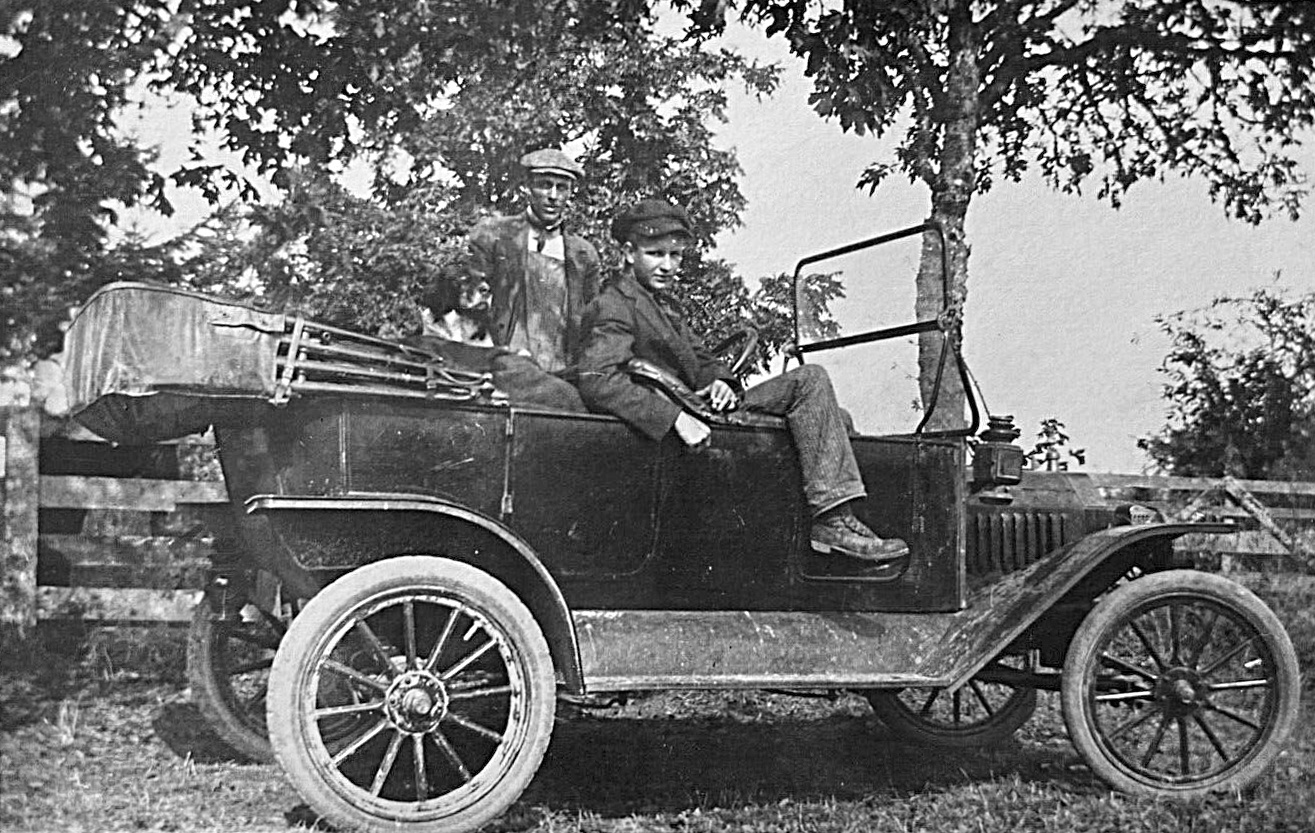 In the first photo, it's not the same boys or car, but the same expression and pose. Probably similar excitement when being photographed in an Automobile back then.