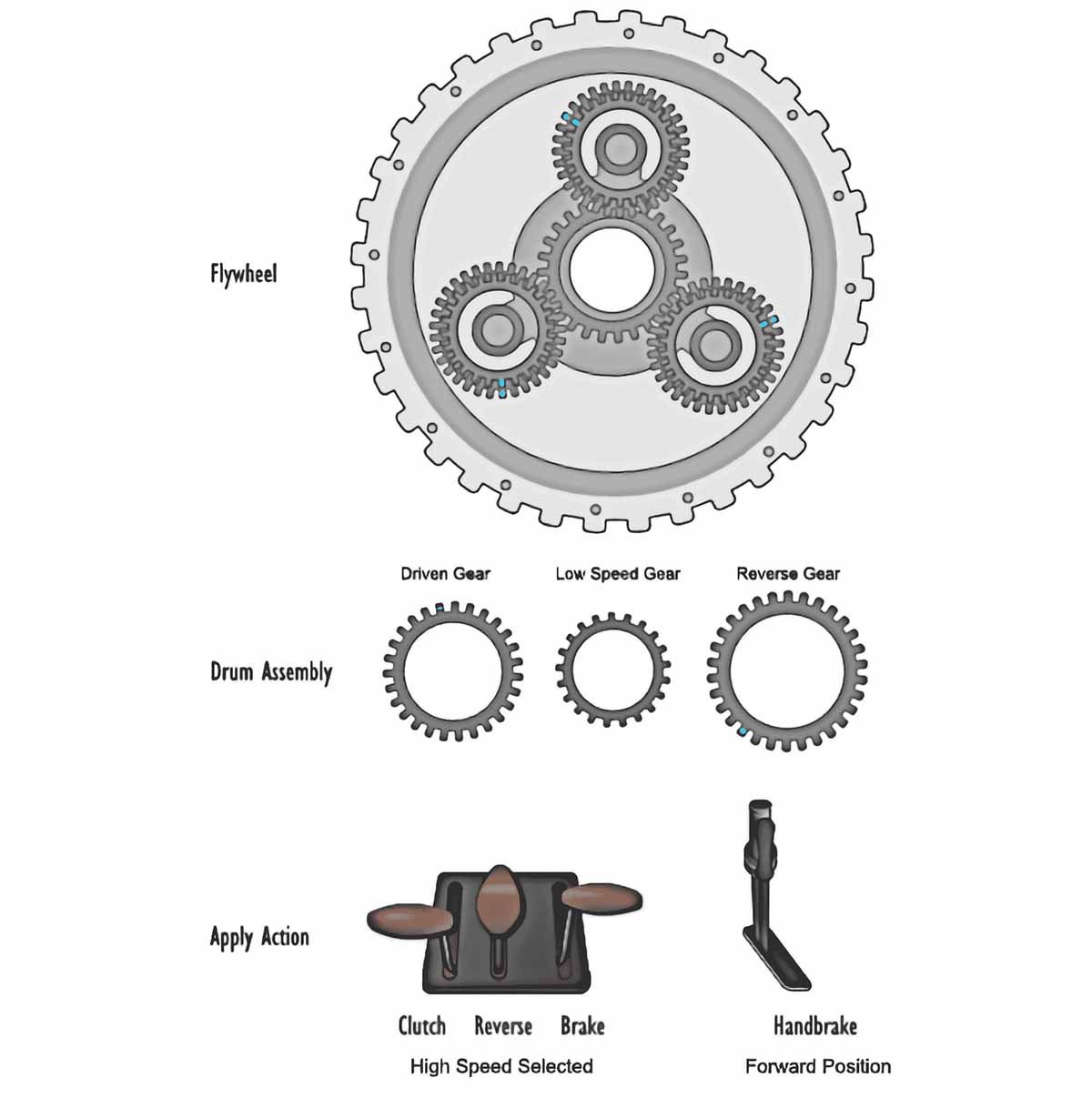 The transmission also includes a set of triple gears that rotate on pins with the flywheel, transferring motion through the transmission. The "neutral" of the Model T is the clutch pedal halfway down so that neither the high clutch is engaged nor the low band is tightened.