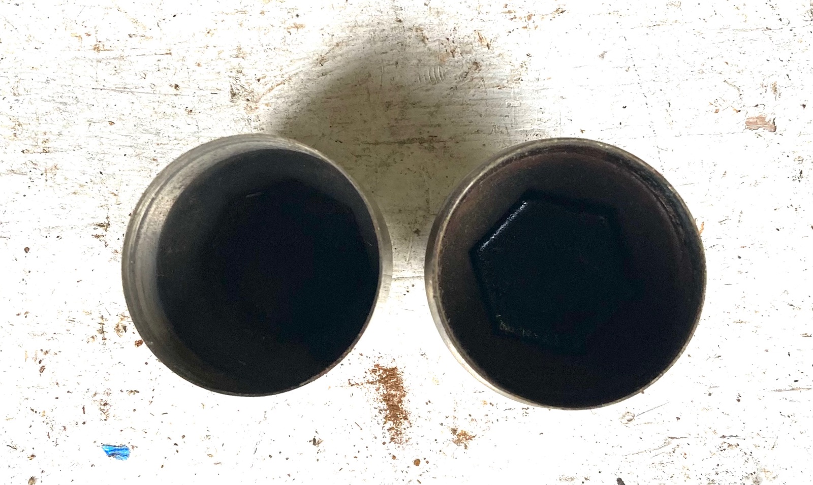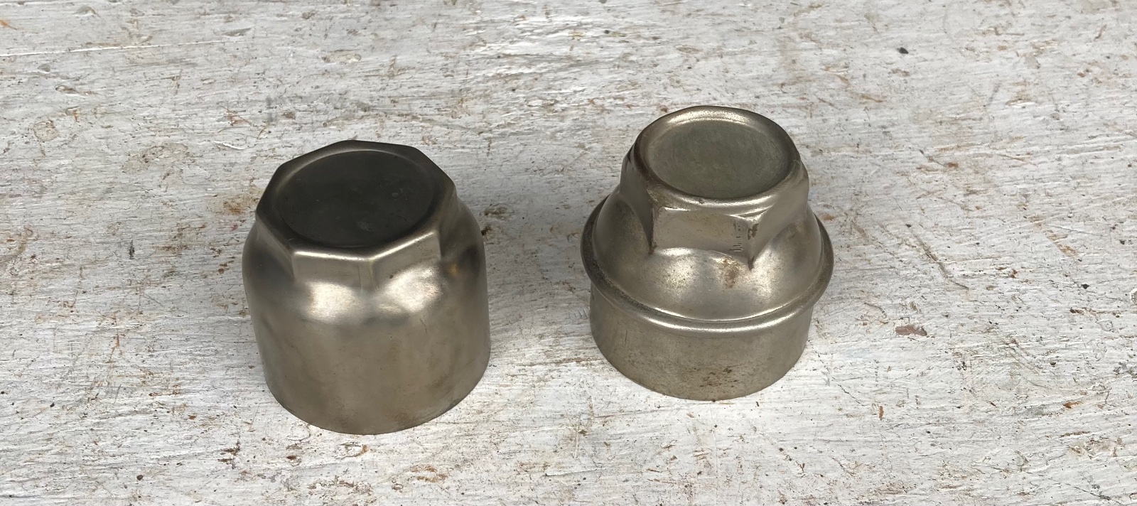 The shorter one on left is octagonal sides. Other is hexagonal. Both nickel plated brass no cracks. Only $30 ea.