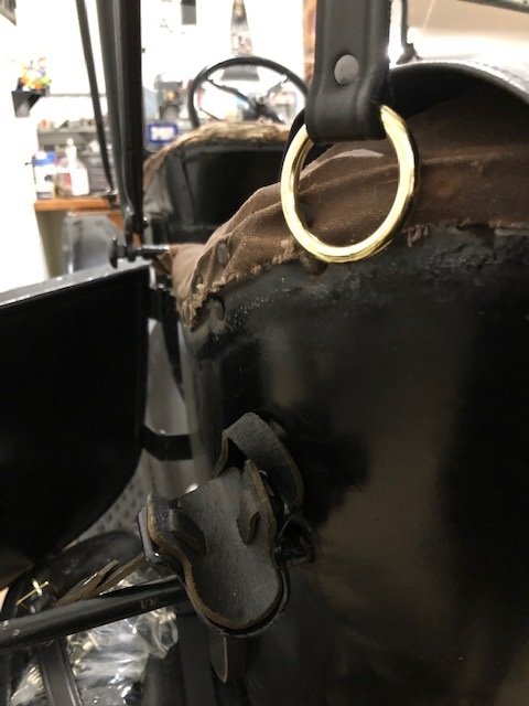 The straps you purchased are not made to fit the 1922 touring car. The straps with the ring fits 1911-1920 tourings and runabouts that have the "L" bracket and top saddle. For your car, a cloth strap was nailed/tacked to the top bow and then nailed/tacked to the tack strip.