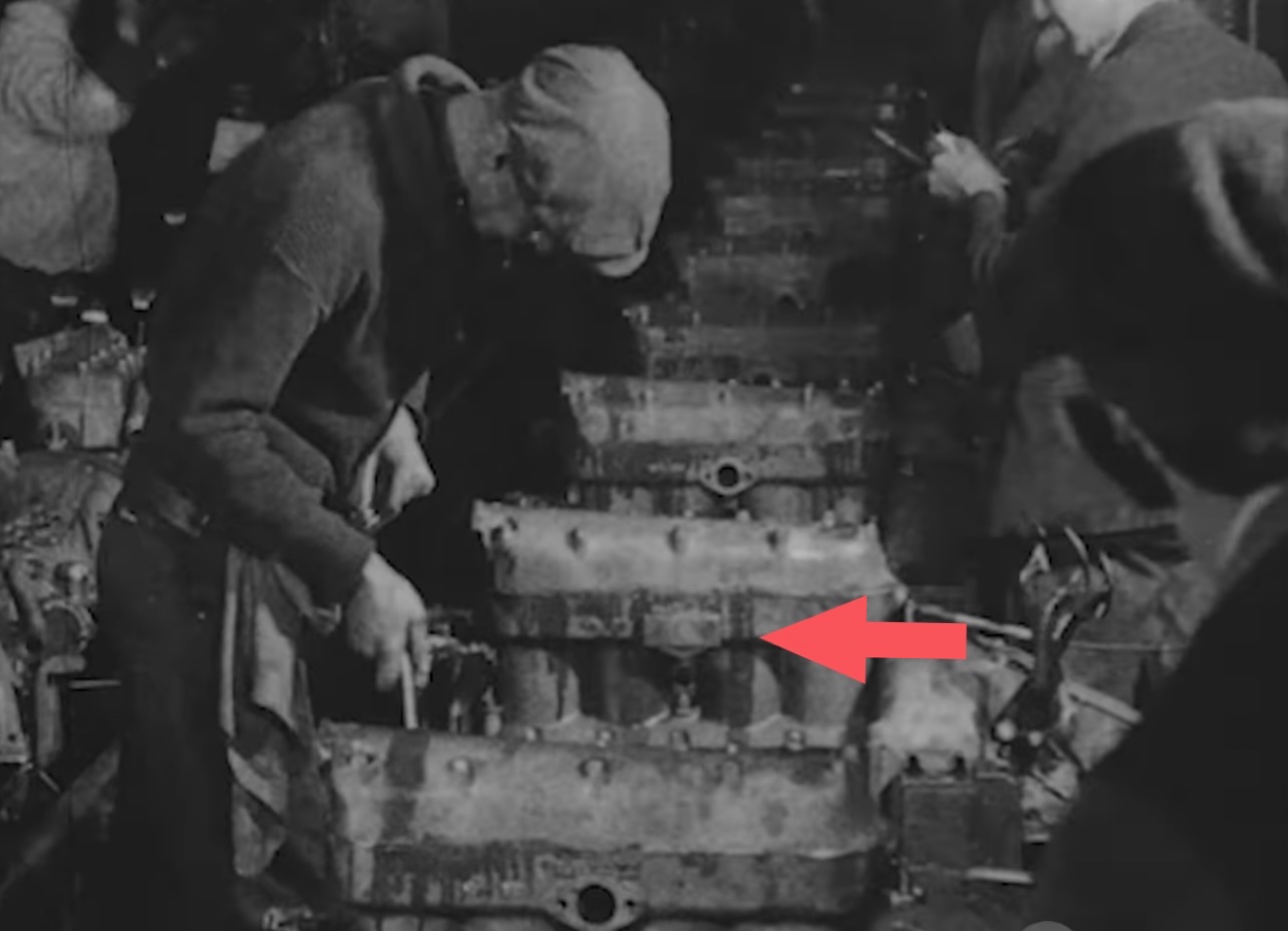 In that same Ford film showing engine assembly you can see that Ford bolted a guide to the water inlet to place the number stamp on , for proper number placement. Also in this film only the last three digits of the engine number are stamped at this time, the other numbers having been stamped prior, the man stamping only stamps three digits in the film at this location.