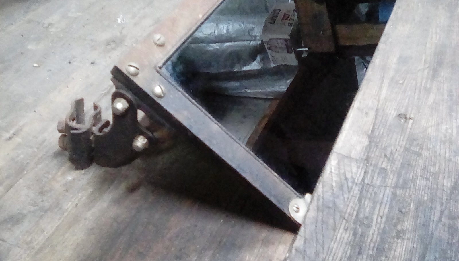 This visor came off of an unrestored 26 Touring and was probably only the old car for its entire life. It is in very nice condition and complete with original paint and glass. I can't decide what color the glass actually is. On the car I always thought it was black but looking through it at my shop lights it had a green hue. Either way it is very dark and you can't really see through it when driving.