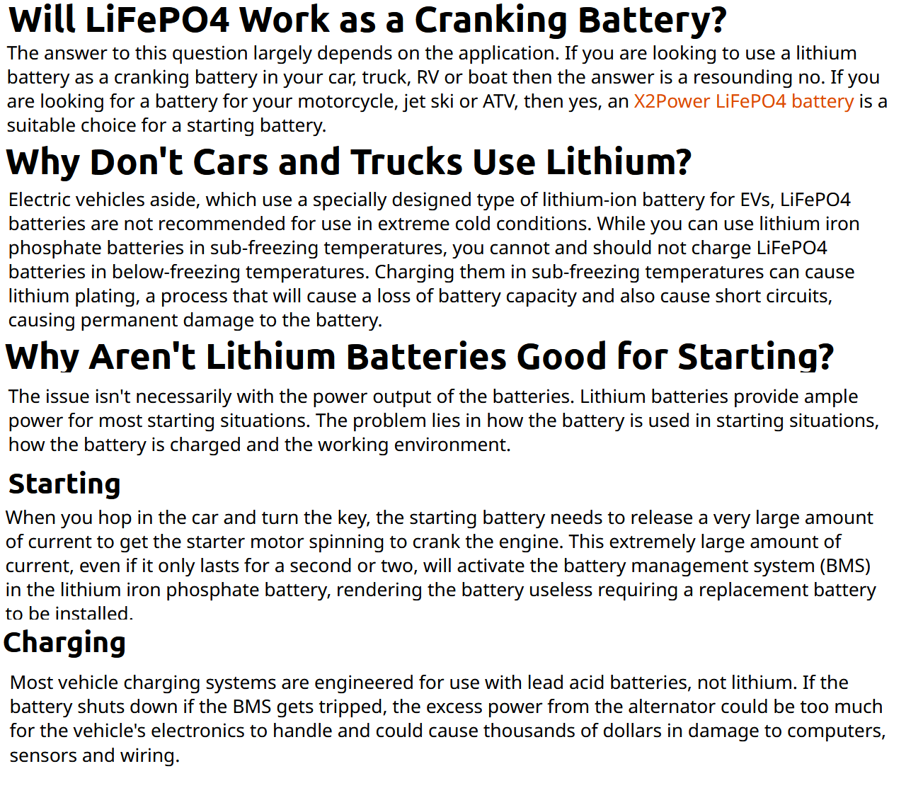 If you are looking to use a lithium battery as a cranking battery in your car, truck, RV or boat then the answer is a resounding NO. If you are looking for a battery for your motorcycle, jet ski or ATV, then yes, an X2Power LiFePO4 battery is a suitable choice for a starting battery.