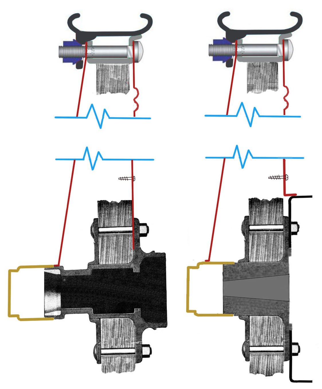 The inside discs of the front wheels were fastened between the hubs and the spokes. as well as the rim bolts. A small door which swung sideways opened an area around the valve so the valve could be reached.
