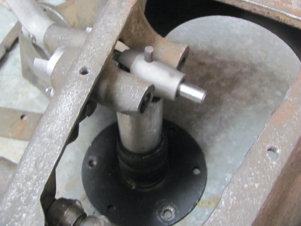 New owner of a 1912 Model T with later hogshead and starter. See the photo below noting the exposed portion of the clutch shaft coming out of the hogshead as indicated by the gray pen in the photo. Aout 1/2 " of shafting is exposed. The problem is that the linkage coming off the clutch pedal is interfering with the side of the cylindrical "can" that houses the starter bendix. A previous owner actually dented in the "can" to provide clearance for the linkage. It resulted in cracking the "can" developing an oil leak. What is the suggested fix? I do not want to pull the engine at this point given upcoming tour season.