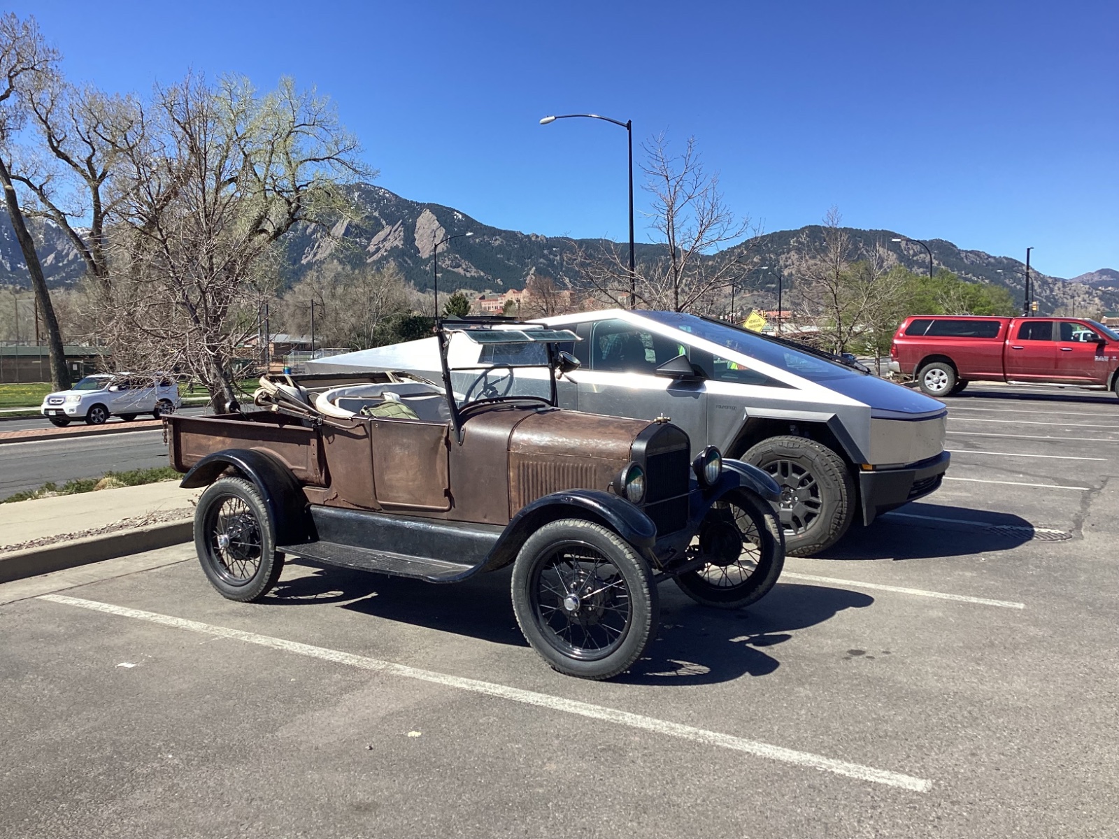 I consider myself smart for living in Boulder, but really, I’m lucky to have a place to use my T almost daily and almost all year round too. One of these days I’d love to build a car capable of touring long distances and do it, but really I like the the day to day of explaining it to people. Wondering why it starts on half a pull sometimes and half hour later other times, keeping a cookie sheet handy to throw on the ground, bouncing half out from hitting huge potholes, constantly adding water to the leaky radiator, showing the coils to curious guys who think they know everything, and all the other charming nuances we’re familiar with add up to the nicest part of my day most days! Well, maybe not today…-Chris, in Boulder