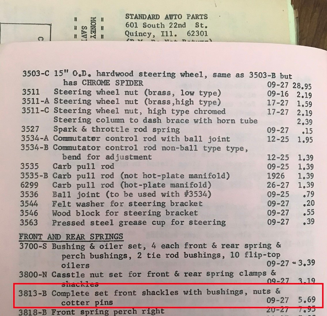 My first order of Model T parts by mail, was from Standard Auto Parts in Quincy Illinois. I received shackles & spindle bolts in those pale yellow boxes with red lettering. Still have a box of shackles. Don't know if the soucer of parts can be identified by the pale yellow box. As many know Earnest Hemmings of the same Standard Auto Parts is the one that started Hemmings Motor NewsRodger Erickson wrote: ↑Sun May 05, 2024 10:27 amFound these shackles in the pile of stuff that didn't sell at Bakersfield... apparently these were first sold in the 1960's, and probably made in Japan. Has anybody had any experience (good or bad) with repop shackles such as these? I have to ask, because repop parts market was kind of a free-for-all a couple generations ago, and a lot of low-quality ("spurious" as Mr. Ford would say) parts were unloaded on unsuspecting buyers. These particular parts look decent enough, but I don't want to find out otherwise at 40 MPH. Please let me know what you think.